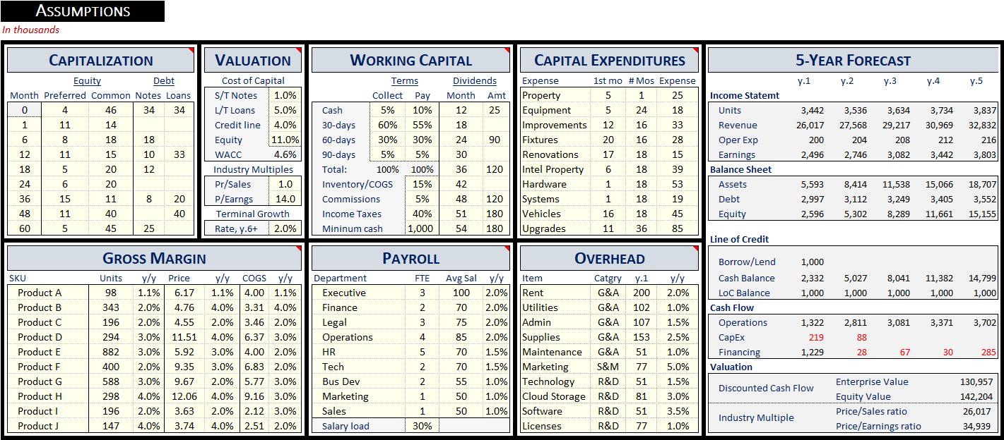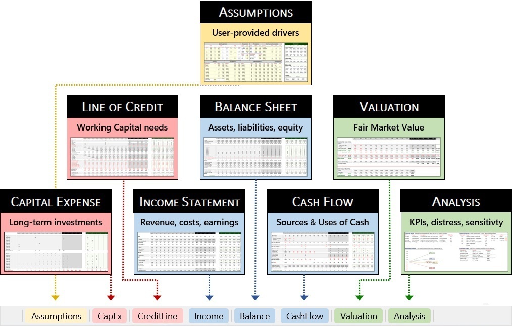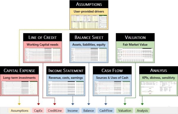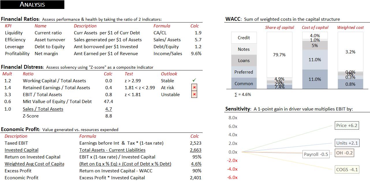 - KPI tracking, key ratios, sensitivity analysis, & stress-testing